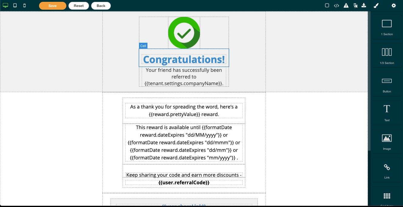 - Buttons to Save the changes made to the email, Reset back to the default version, or head Back to the Program Settings page.