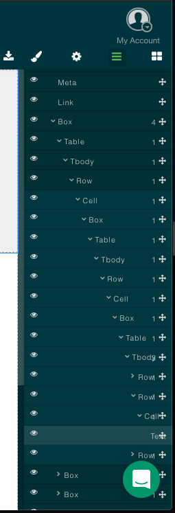 The third lists all of the components in their hierarchical structure starting with the top body tag and going down. You can adjust the level a component is at by clicking and holding on the move icon and dragging the component up or down. Components can also be hidden using the eye icon to the right. Adjusting these settings will adjust any components nested within the component you have highlighted.