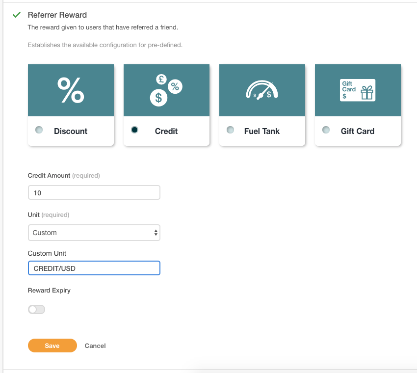 USD) when configuring Stripe, then you will addCREDIT/USDas the custom reward unit. The pattern isCREDIT/{CURRENCY_CODE}for rewards to be picked up by Stripe. - If you selected a Custom unit when configuring Stripe, you will need to utilize that unit if you want Stripe to automatically fulfill the reward. Using the above examples, in the Custom unit field of your program, you would enter
