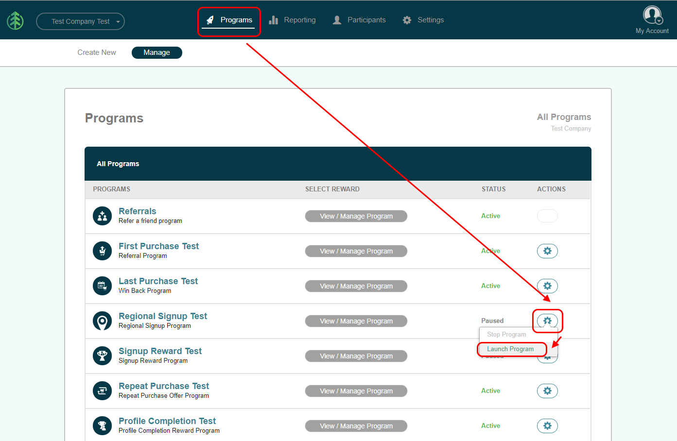 Once you have finished configuring your program, return to the Programs page in the SaaSquatch portal. From there, select the Launch Program option from behind that program's "gear" icon.