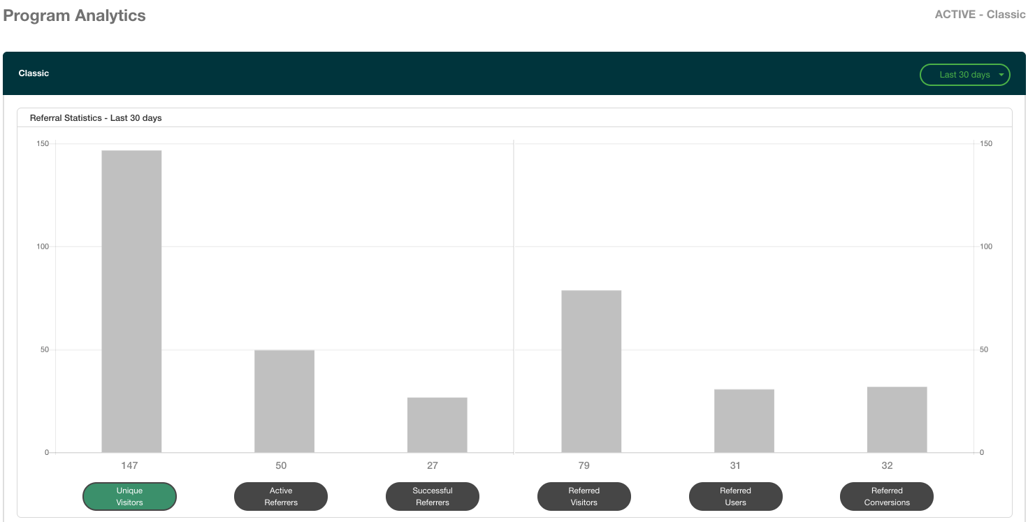 - Referred Visitors: The number of times your referral program sharelinks have been clicked.