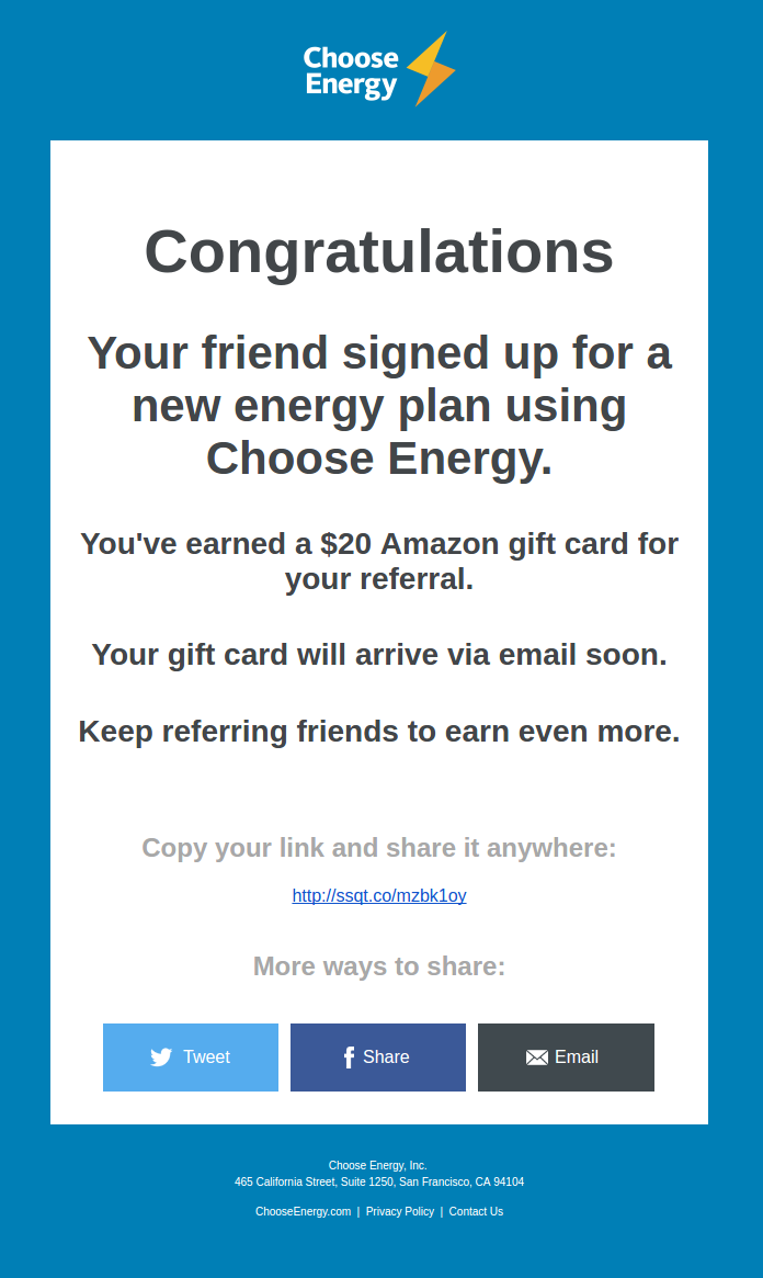Referrers that have successfully started or completed a referral already receive email updates from SaaSquatch on your behalf notifying them of their progress towards receiving their reward. In these emails we include links for them to make additional shares through email, Facebook, or Twitter.